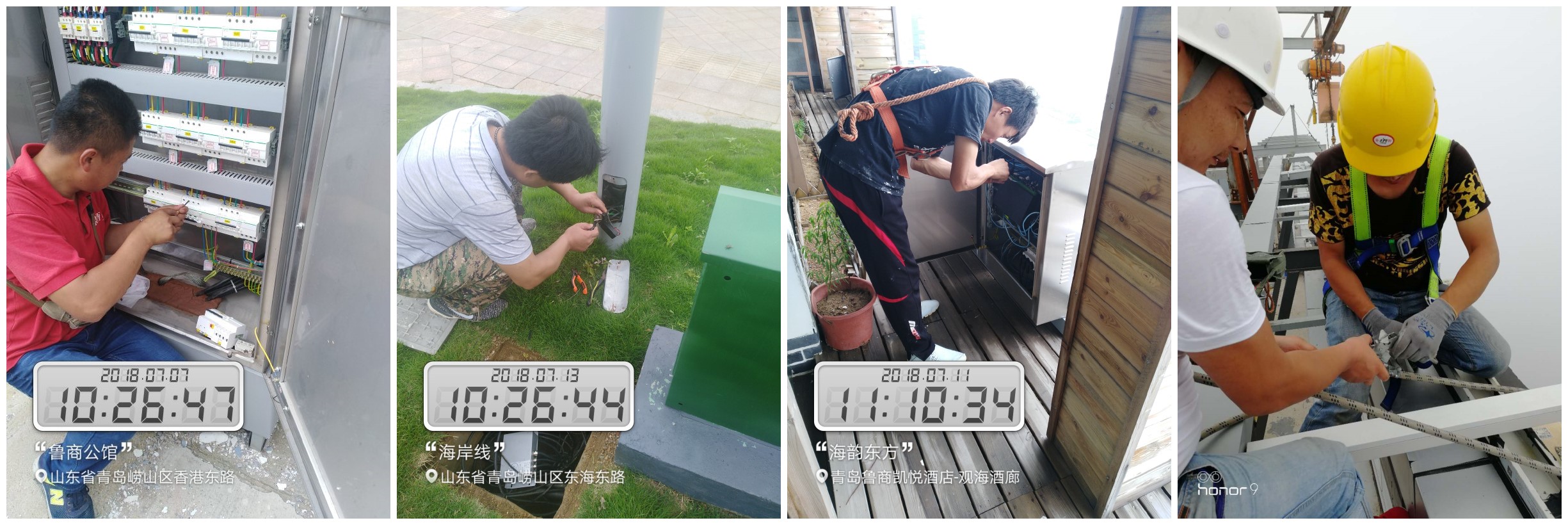 “以技術(shù)為核心,用服務(wù)創(chuàng)價值”是我們企業(yè)的核心價值觀,絕不因為時間緊、配電箱沒回路圖,每個廠家的配電箱不一樣,色溫控制儀60%都接錯就坐以待斃。沒有二次回電圖,就嘗試自己摸索,從最開始的一天一臺的摸索,到后來的一天十臺的熟練。解決了由于各個廠家不一樣,配電箱不一致的問題。“只要有元件、配電箱”就能做出一個實現(xiàn)功能的系統(tǒng),比預(yù)期完成安裝時間提前了近一周的時間。三天完成摸索、實驗,47天完成200個點位、44個搖臺的控制系統(tǒng)。早上7點30出門,晚上12點才回到住處,飯都蹲在地上吃完。一個多月,完成三個標(biāo)段中一期一標(biāo)的亮化工程的控制系統(tǒng)安裝,三個標(biāo)段的系統(tǒng)調(diào)試、維護(hù)。在技術(shù)攻堅和管理創(chuàng)新的助力下,嶗山夜景行風(fēng)景被創(chuàng)造了出來。