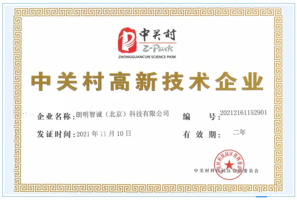 經中關村高新技術委員會評審核準,朗明智誠(北京)科技有限公司于2021年11月10日,榮獲“中關村高新技術企業(yè)”。