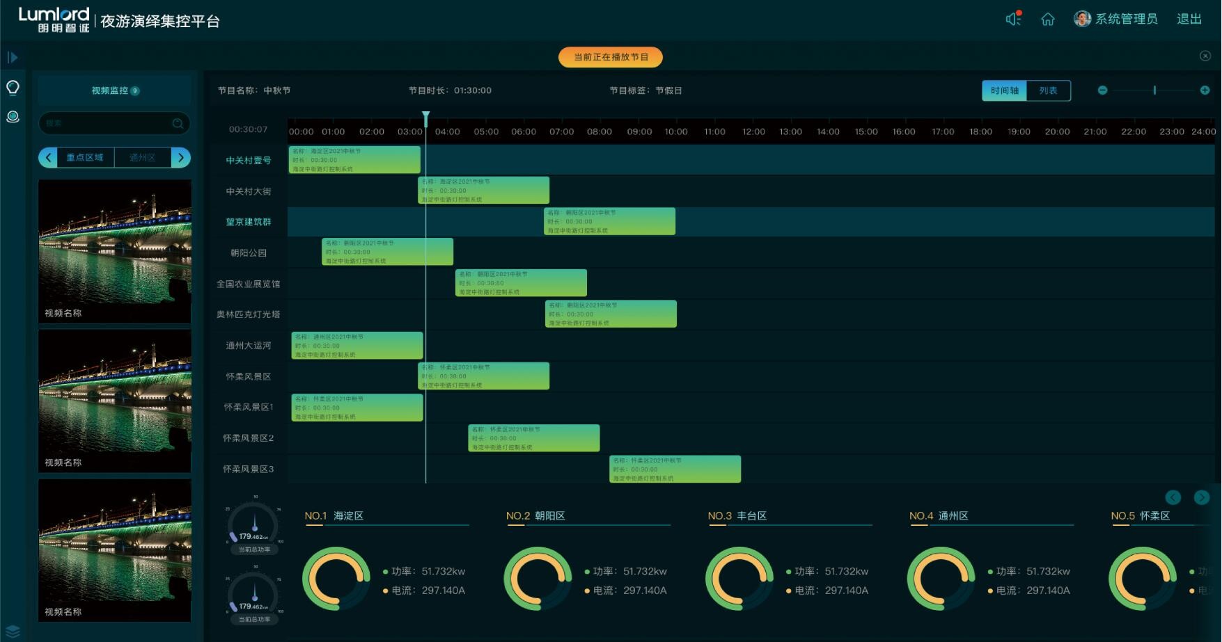 面向中大型文旅夜游演繹項(xiàng)目,實(shí)現(xiàn)對(duì)區(qū)域內(nèi)各系統(tǒng)節(jié)點(diǎn)的聲、光、電、水、霧等演繹設(shè)備設(shè)施的集中智能監(jiān)測、管理、運(yùn)維和控制,降低演繹事故風(fēng)險(xiǎn),節(jié)約電能消耗,有效提高夜游演繹項(xiàng)目的管理水平。